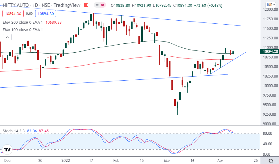 Currently NIFTY AUTO index is trading above 200 days exponential moving average and suggests long term trend is bullish. EquityPanditβs analyst predicts range for the week is seen from 10600 on downside and 11200 on upside.