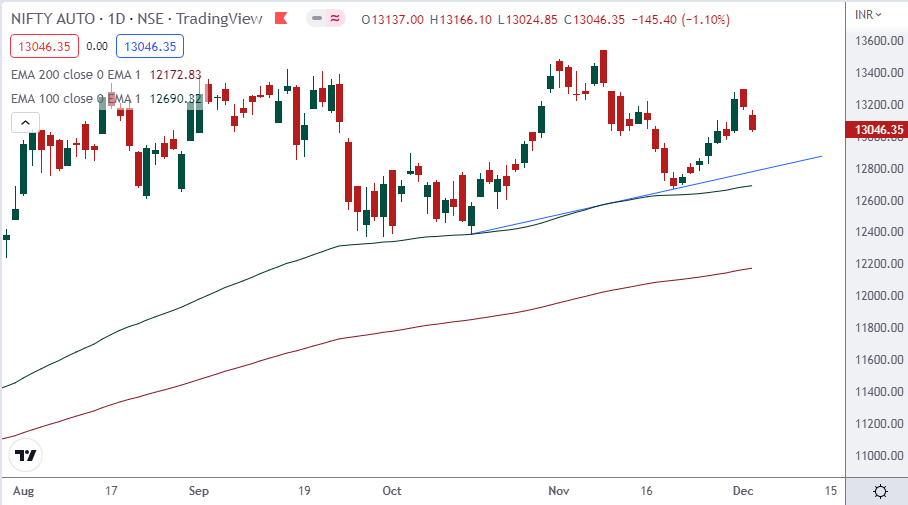 Currently NIFTY AUTO index is trading above 200 days exponential moving average and suggests long term trend is bullish. EquityPanditβs analyst predicts range for the week is seen from 12800 on downside and 13300 on upside.