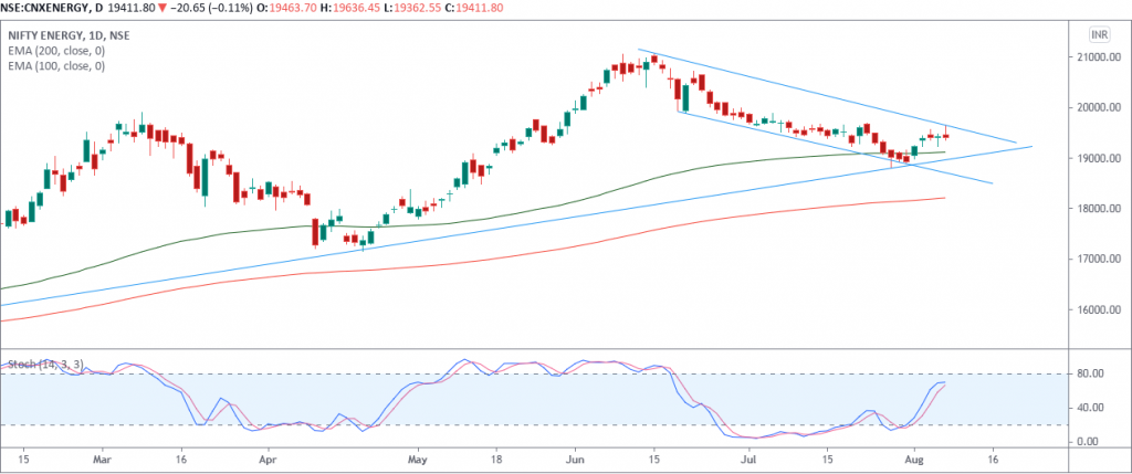 Currently NIFTY ENERGY index is trading above 200 days exponential moving average and suggests long term trend is bullish. EquityPanditβs analyst predicts range for the week is seen from 19000 on downside and 19800 on upside.