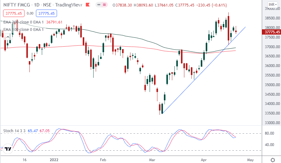 Currently NIFTY FMCG index is trading above 200 days exponential moving average and suggests long term trend is bullish. EquityPanditβs analyst predicts range for the week is seen from 36900 on downside and 38600 on upside.