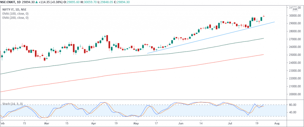 Technically on the daily charts we see minor support on the downside for Nifty IT index lies at 29500 levels, whereas minor resistance on the upside is capped around 30250-30300 levels.