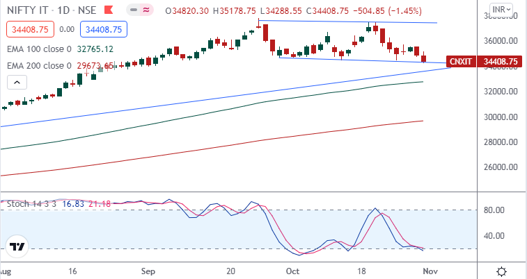 If Nifty IT index breaches minor support on the downside and closes below it, we may see fresh break down and index can drag towards major support on lower side around 33300 and if breaches minor resistance on the upside and closes above it, we may see fresh breakout and index can head towards higher levels around 35300.