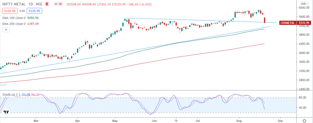 Currently NIFTY METAL index is trading above 200 days exponential moving average and suggests long term trend is bullish. EquityPanditβs analyst predicts range for the week is seen from 4900 on downside and 5700 on upside.