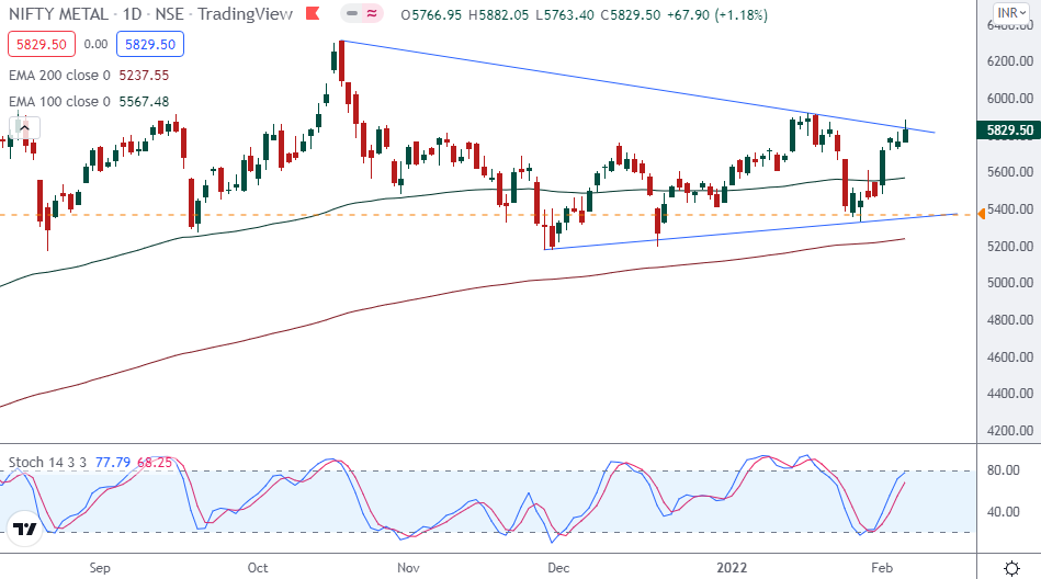 Currently NIFTY METAL index is trading above 200 days exponential moving average and suggests long term trend is bullish. EquityPanditβs analyst predicts range for the week is seen from 5550 on downside and 6100 on upside.