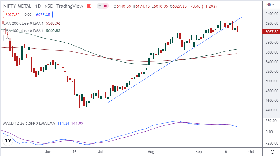Currently NIFTY METAL index is trading above 200 days exponential moving average and suggests long term trend is bullish. EquityPandit’s analyst predicts range for the week is seen from 5850 on downside and 6200 on upside.