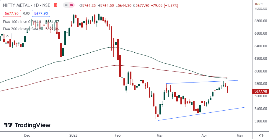 If NIFTY METAL index breaches minor support on the downside and closes below it, we may see fresh break down and index can drag towards major support on lower side around 5,525 and if breaches minor resistance on the upside and closes above it, we may see fresh breakout and index can head towards higher levels around 5,850.