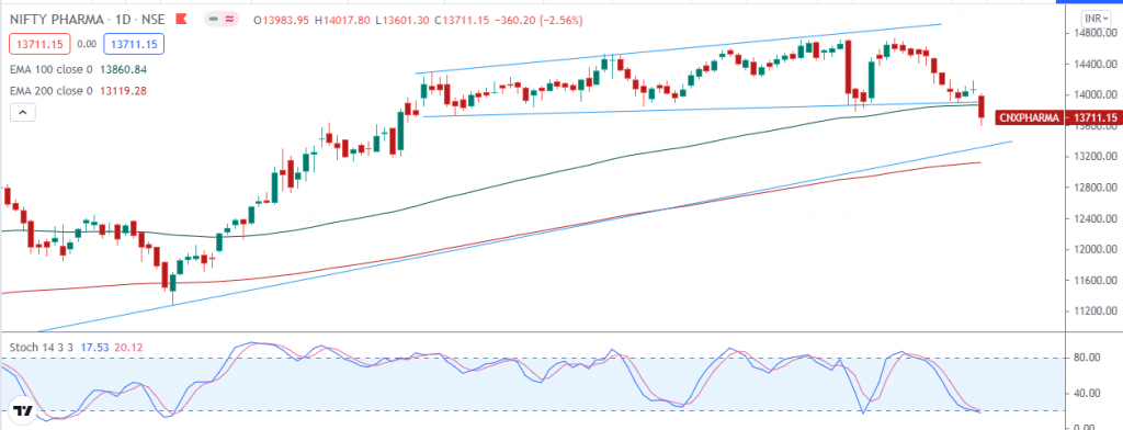 If NIFTY PHARMA index breaches minor support on the downside and closes below it, we may see fresh break down and index can drag towards major support on lower side around 13200 and if breaches minor resistance on the upside and closes above it, we may see fresh breakout and index can head towards higher levels around 14200.