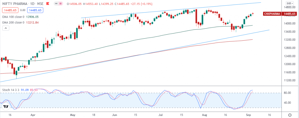 Currently NIFTY PHARMA index is trading above 200 days exponential moving average and suggests long term trend is bullish. EquityPanditβs analyst predicts range for the week is seen from 14100 on downside and 14900 on upside.