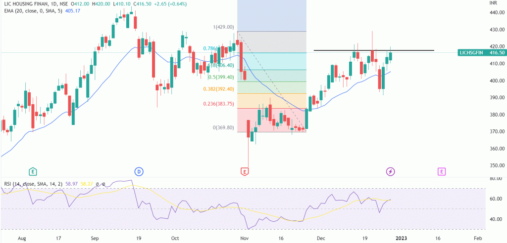 LICHSGFIN stock price has been consolidating since a few days near 417-418 levels and is currently moving near the neckline. This zone has now become an important resistance for the stock. In the previous session, stock retested the same level with positive momentum but didnโ€™t close above the break out zone. The Relative Strength Index (RSI) on the daily chart is 58, indicating bullishness. A move above 418 will indicate the fresh buying in the stock.